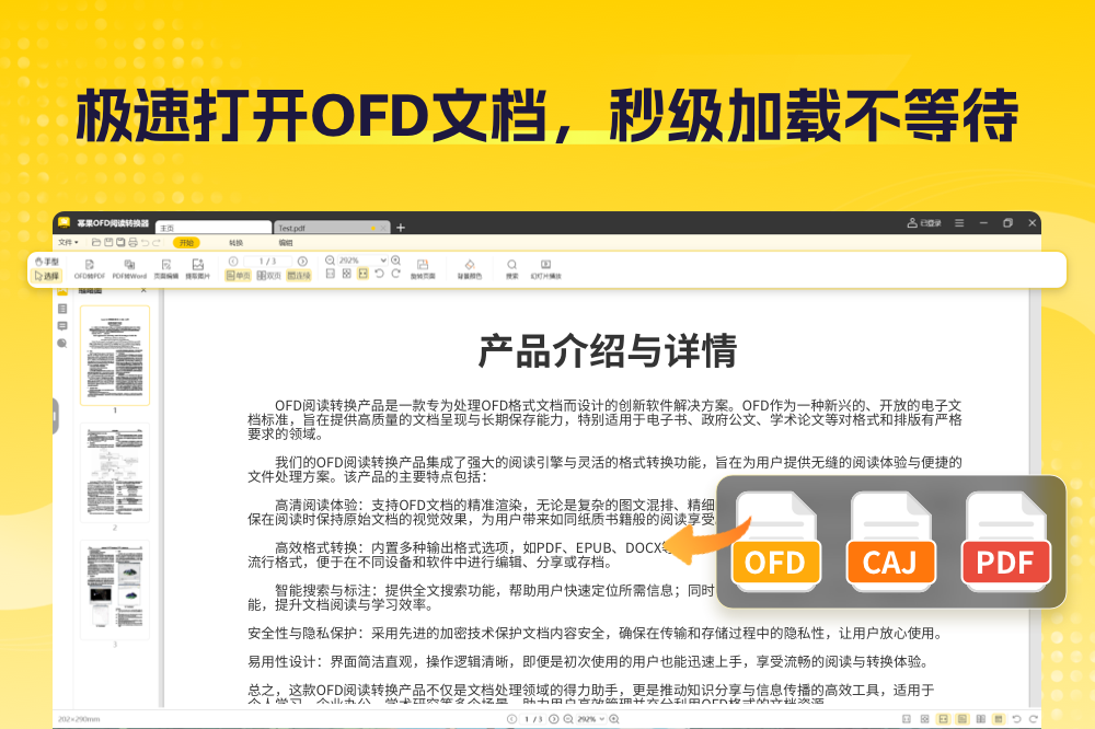 OFD阅读转换器——专业高效的文档处理工具 • 极速秒开OFD文档,精准解析格式内容 • 一键轻松实现OFD与PDF、Word等格式互转 • 支持批量转换,高效处理多文件任务 • 完美输出PDF、DOC、DOCX、TXT等多种格式 • 智能优化文档排版,确保转换质量 • 显著提升办公效率,优化文档处理流程 让文档处理更简单,办公效率更高效!