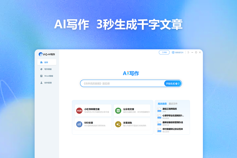 一站式多功能创作神器,轻松驾驭各类文案与写作需求! 小Q-AI写作是一款集合同模板生成、文案策划、小红书种草方案、公众号文章撰写、文章润色、小说扩写、中英文写作以及视频脚本写作等几十种功能于一体的AI写作软件。它以其强大的智能算法和丰富的模板库,为用户提供了前所未有的便捷与高效。 无论您是职场人士需要快速生成合同模板,还是营销人员需要策划吸引人的文案,亦或是文学爱好者想要扩写自己的小说作品,小Q-AI写作都能轻松应对。其智能推荐系统还能根据您的写作习惯和喜好,为您提供个性化的写作建议,让您的作品更加出色。 此外,小Q-AI写作还支持中英文写作,打破了语言障碍,让您的创意能够跨越国界,触达更广泛的受众。对于视频创作者来说,它还能一键生成视频脚本,让您的视频内容更加生动有趣。 总之,小Q-AI写作是一款不可多得的创作神器,它以其全面的功能和出色的性能,帮助用户轻松驾驭各类文案与写作需求。快来下载小Q-AI写作,开启您的创意之旅吧!