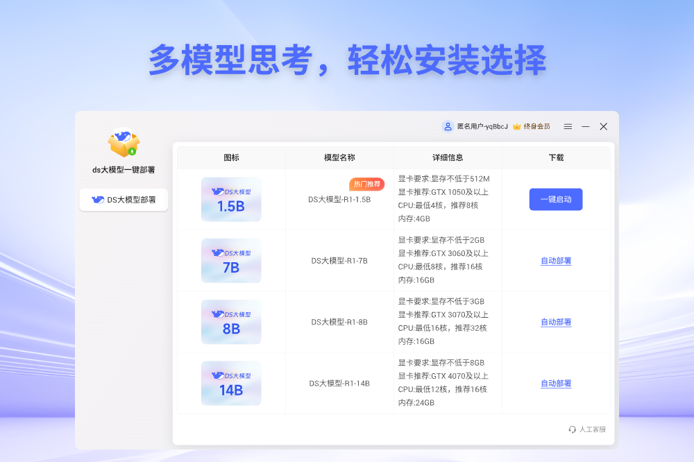 ds大模型一键部署,不等待不卡顿!专业级AI大模型“装进”你的电脑。 三个步骤,傻瓜式操作,1分钟轻松上手,快速实现AI应用,随时随地体验AI强大功能。 【产品特点】 1、一键安装点击即用,无需特殊设置 2、产品简单易用,小白用户简单上手 3、本地部署不强依赖网络,彻底告别“思考中、服务器繁忙” 4、本地部署,永久有效 【此软件为DS大模型本地部署的三方工具,非deepseek官方产品】
