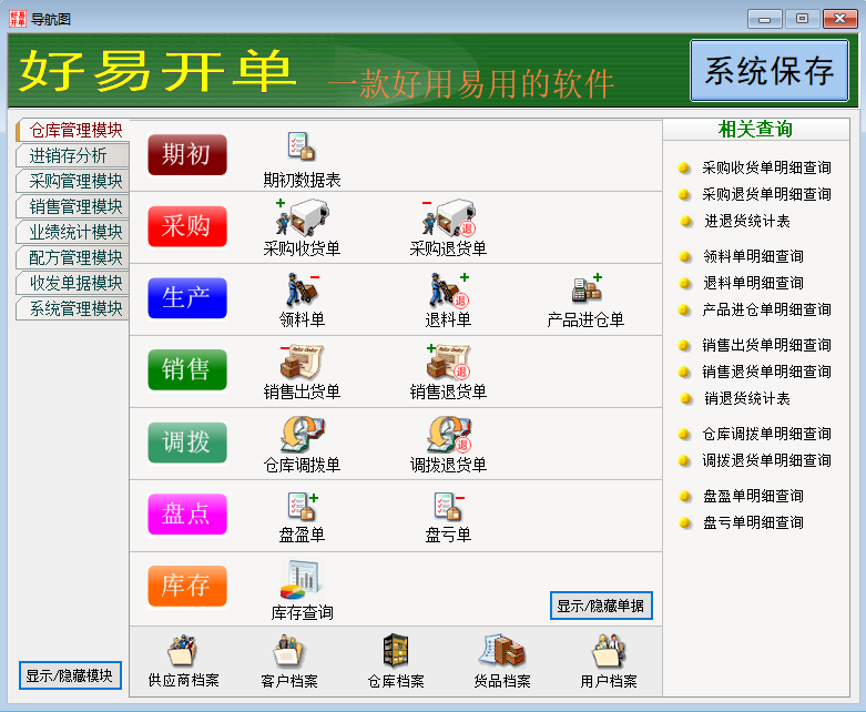 好易开单软件,是一款Windows下的进销存软件。与一般进销存软件不同,好易开单软件更强调开单的方便性和数据分析的易用性,好用易学,一看就会。包含仓库管理、进销存分析、销售管理、采购管理、配方管理、业绩统计等多个模块。