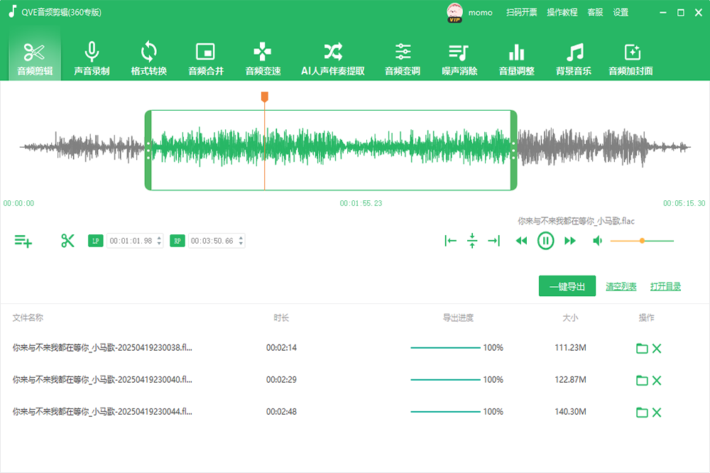 QVE音频剪辑一款集音频剪辑,AI人声伴奏提取、音频变调、录音、转换、合并、提取、噪声消除、音量调整为一体的音频编辑软件,能够很方便的剪辑mp3、flac等音频格式,同时可以录制声音,对音频格式进行转换、合并、从视频中提取声音、对视频和声音进行噪声消除,是一款非常适合初级用户的音乐剪辑软件。