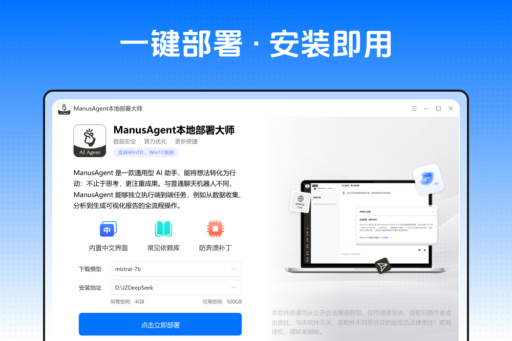 AI Agent本地部署,通用型AI智能体助手本地安装,ChatAgent本地部署工具是一款简单易用、功能超强的通用型AI Agent本地化一键安装部署软件,免去繁琐配置流程,零基础用户也能快速部署属于自己的通用型AI智能体。ChatAgent的核心优势在于“不止会思考,还会提供结果”,凭借独立思考和系统规划,灵活运用各种工具,在自己的虚拟环境中高效完成任务。可以帮您:编写和执行代码、智能浏览网页、操作各类网页应用,进行如个性化旅行规划、股票分析、保险条款比较、网页开发等方面的工作。 【功能特点】 1、免配置,一键安装部署,点击即用 2、小白用户轻松上手,无需代码基础 3、本地运行,数据就在您的电脑中,安全可靠 4、任务式执行,不仅能看到过程更能得到结果 5、兼顾本地和在线模型应用,随心切换 6、持续学习,记忆您的偏好,打造属于自己的AI