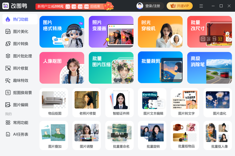 改图鸭整合了图片压缩、格式转换、编辑美化、修复处理及AI技术于一体。该应用支持百余种图片格式转换,提供在线处理功能,无需下载即可使用。功能涵盖智能证件照制作、照片变漫画、老照片修复等,适用于平面设计、电子商务及日常使用场景。用户反馈其界面简洁、工具齐全,满足多样化图片处理需求。