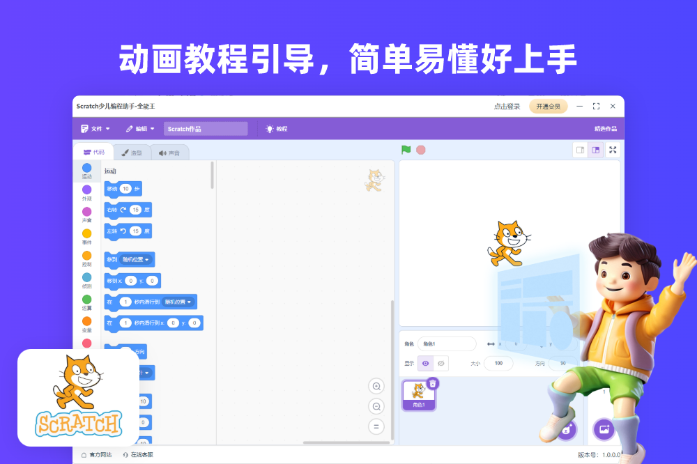 全能王Scratch少儿编程软件,是一款功能全面且用户友好的编程教育工具。它通过创新的积木式编程界面,使得编程学习过程直观而富有趣味。该软件特别适用于8至16岁青少年的编程初学者,并且也广泛用于成人的编程基础教育中。通过其独特的“创造-分享-再创造”的学习循环,Scratch有效地培养了用户的计算思维和创新能力。为了降低学习难度,软件内集成了大量视频教程及精选实例,并提供了详尽的Scratch指令大全,其中包括各个积木块的功能解释,大大简化了学习过程。总体来说,Scratch少儿编程软件是一款强大且易于上手的学习工具,非常适合儿童和成人初学者使用。