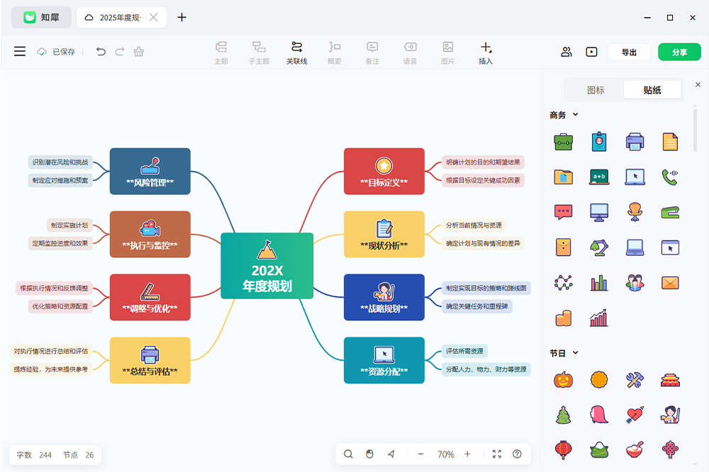 知犀思维导图是一款高效思维图示脑图软件,易上手/颜值小清新,支持免费插图/不限节点数/AI生成等多项专业功能,多人在线协作和离线编辑,且内置有30000+精品模板供参考。用知犀创作思维导图时,您可专注于思考和思维梳理,而不用花时间研究软件功能。