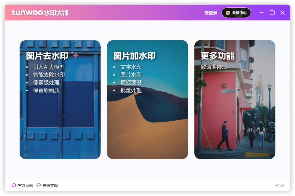 sunwoo水印大师是一款基于AI大模型的专业水印处理工具。支持一键智能去水印、批量添加文字或图片水印、位置与样式精细控制,并在尽可能保留原图清晰度的同时,快速完成处理。适合电商运营、设计师、自媒体创作者与办公用户的高效工作流。