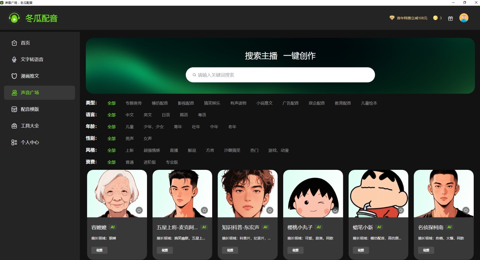冬瓜配音是一款功能齐全的在线将文字转语音的AI配音软件。提供免费ai配音,声音克隆、漫画推文、文案提取、人声处理、背景音处理等功能,只需输入文本内容即可一键合成语音,可快速实现文本朗读、视频配音、广告、课件、影视解说等的配音工作,是一款功能强大的ai在线配音生成器。
