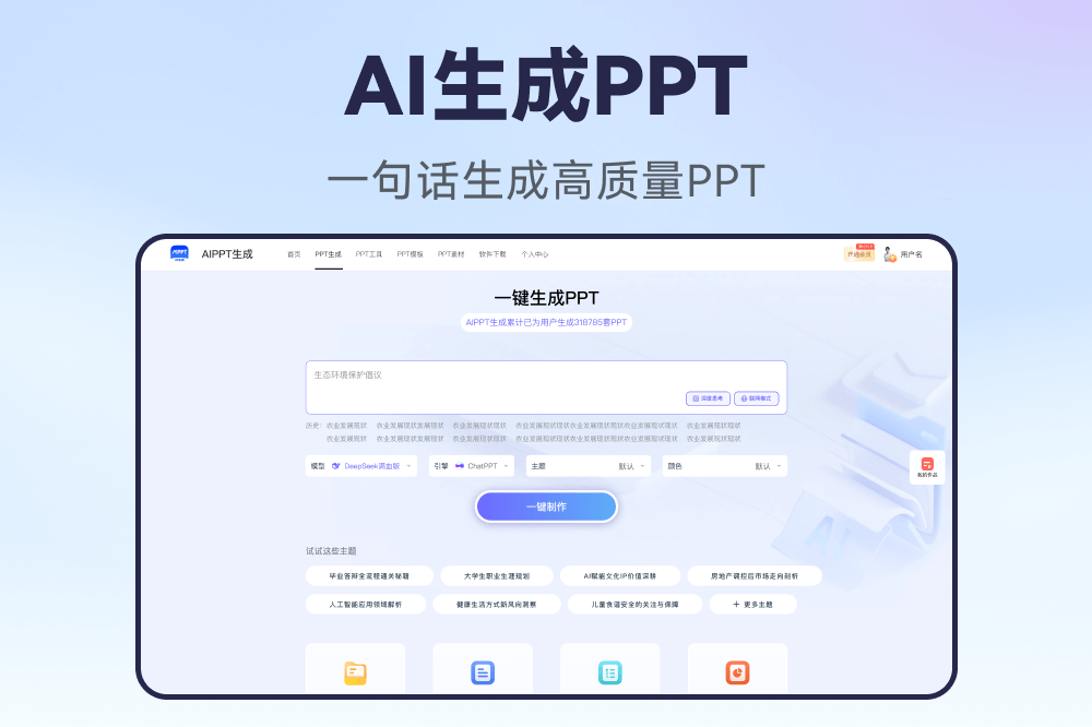 AIPPT生成,做PPT一点也不难!一句话生成精美PPT!AI智能排版,海量模板任选,3分钟轻松搞定教师课件、工作汇报、毕业答辩等各类幻灯片,高效专业又省心!