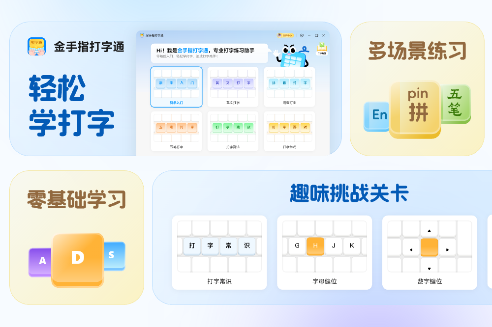 金手指打字通是一款集英文打字、拼音打字、五笔打字、打字游戏等功能于一体的全能打字练习软件,助力您从零基础轻松入门,速提打字效率,轻松蜕变为打字高手! -新手入门:科学体系,循序渐进。金手指打字通内置一套科学的学习路径,包含认识键盘、基础指法、基础练习等课程安排,一步步巩固肌肉记忆,纠正错误习惯,零基础轻松入门 -多种输入法练习:英文打字、拼音打字、五笔打字三种主流输入法的针对性练习,满足各种打字练习需求 -英文打字:从A到Z键位记忆开始,逐步过渡到单词、短句,英文文章,提升编程效率、英文输入水平 -拼音打字:专为中文用户设计,内置海量词库、文章,助您轻松实现“所想即所打” -五笔打字:提供完整的字根教学、拆字练习和口诀记忆,追求极致速度和盲打体验用户的终极选择 -打字测试:实时测试,精准反馈。提供限时、选择文章等测试方式,稳步提升打字速度与准确率