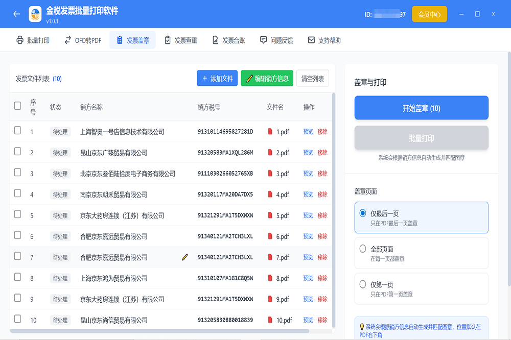 - 发票盖章:智能识别销方信息,自动生成电子印章,批量盖章处理,提高工作效率