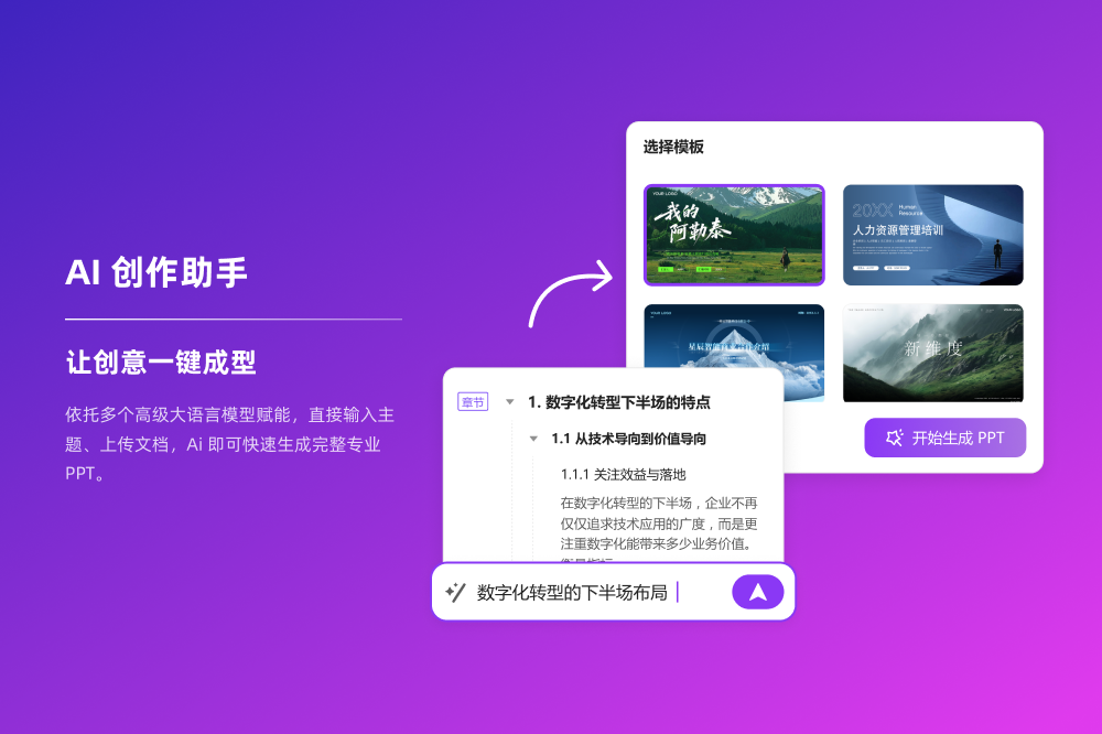 【AI 创作助手】仅需输入一句话或上传文档,即可快速生成完整专业PPT文档;支持AI生成单页、模板生成,智能辅助撰写与润色,全方位助力用户高效产出具备专业水准的PPT