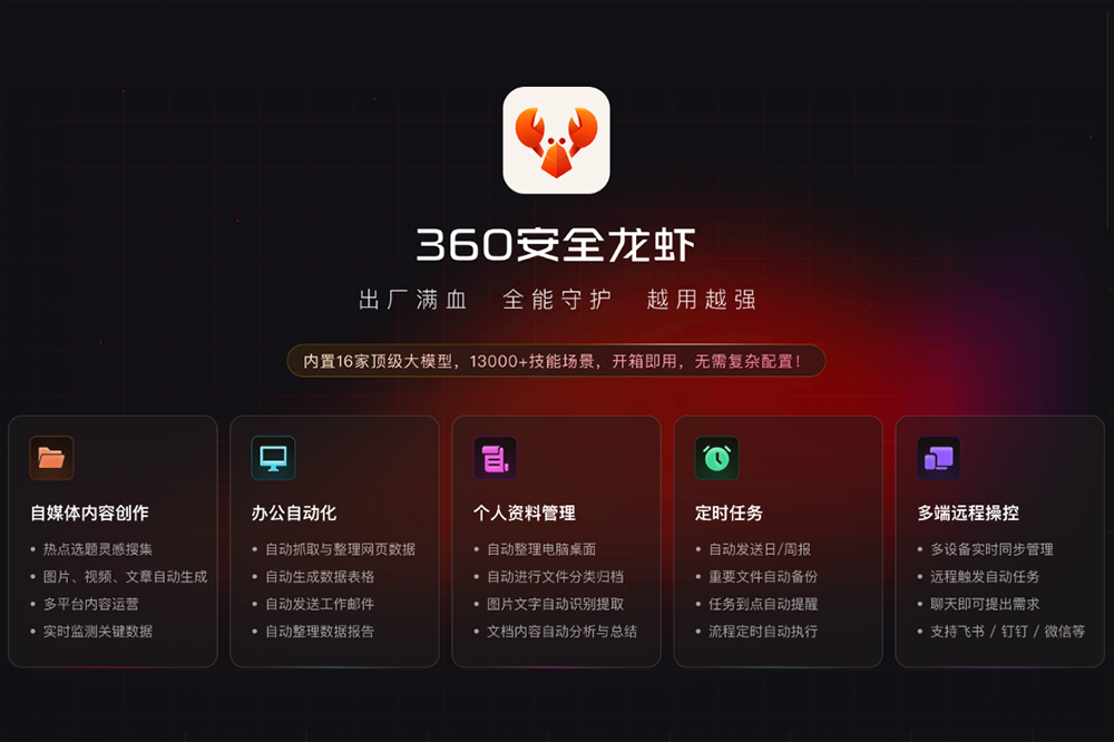 360安全龙虾是一款集成了16家顶级大模型、13000+技能场景的智能桌面客户端工具,支持一键安装、自动部署,用户无需复杂配置即可开箱即用。它不仅能聊天,更能通过“找技能、用技能、写技能”完成复杂任务,覆盖办公、营销、写作、数据处理等各类场景。一站式使用顶级模型:内置16家大模型厂商的数十个顶尖模型(如DeepSeek、智谱等),无需切换账号或配置密钥,智能调度最优模型处理你的任务。13000+技能自动执行:不再只是聊天。内置海量“技能”,能自动完成写邮件、做报表、分析合同、追踪舆情、整理文档等具体工作,真正把活儿干了。安全可靠,开箱即用:延续360的安全基因,提供恶意技能拦截与本地沙箱存储,数据安全有保障。无需复杂设置,安装即可体验。预装精选技能,恶意技能主动拦截。本地沙箱存储,支持持久化记忆与手机端协同
