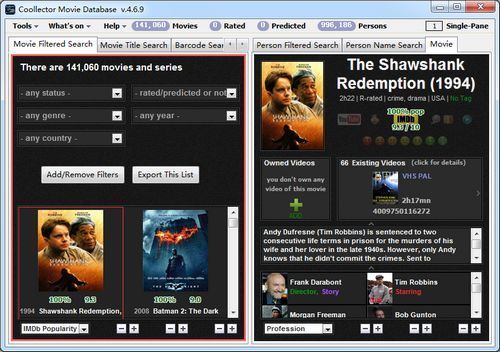 该软件是介于电影百科全书。视频收藏管理器(拥有的 DVD,VHS 等…)以及一个存储分类目录之间的混合产品。所有功能紧密结合在一起!换句话说,Coollector 混合了三种类型的信息到一个独特的界面当中:你的电影文化加上你的私人收藏再加上可提供的电影存储。