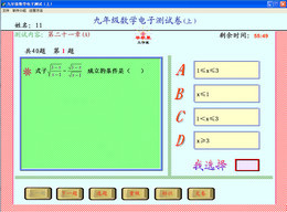 《九年级数学电子测试(上)》是“导航星工作室”制作的“电子测试”系列软件之一。该软件是一个测试系统。可用于学生进行单元自测或教师组织模拟考试。题库中所选试题以新课标为指导,与人教版新教材同步。试题都是极具代表性的典型试题,形式都为选择题。题量多、内容广,几乎涵盖了教材中所有的知识点。可自由选择测试内容,也可由电脑随机组卷,每套试卷有40个题,测试时间为1小时。1小时后自动交卷,交卷结束即可判出试卷,给出成绩,同时排出名次。此时可查看试卷中错误的试题。