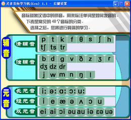 灵者音标学习机是一款来自英语国际音标学习工具,它提供 48 个常用音标的读音和发音嘴型文字说明以及每个音标所对应的词组。滑过或点击音标可以发出其读音或弹出音标信息(右键可设置)点击左边的“清辅音”,则连续朗读所有清辅音,点击“浊辅音”,连续朗读所有浊辅音,点击“辅音”,连续朗读所有的清辅音和浊辅音,点击“元音”(长元音、短元音和双元音)雷同
