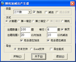 随机加减法产生器功能介绍:1.可以生成100以内的加减计算题、填空题、或随机出题2.可以按需要生成进位加法(默认)、无进位加法,退位减法(默认)、无退位减法3.可以将试题导出为Txt文档、Xls二种格式,导出试题文档中有当前试题的类型,一目了然