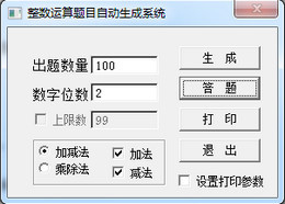 整数运算题目自动生成系统可自动随机生成1-4位整数加减法或乘除题目,可根据需要确定生成题目数量和位数,生成后可在计算机上直接答题,也可打印后答题,是给孩子出题的好帮手