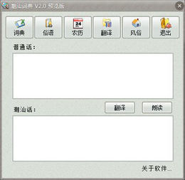 潮汕词典一款收录潮汕方言俗语并支持语音朗读的免费软件,本词典旨在传播潮汕文化,方便更多人了解学习潮汕语言。软件功能分为五部分:1.词典,收集方言常用的特殊词。2.俗语,收集日常用语习惯性语句。3.字典,收集2万多个汉字拼音和注释。4.翻译,支持中文、英文和日文相互翻译。5.百科,收录潮汕有特色的风俗文化相关词条。