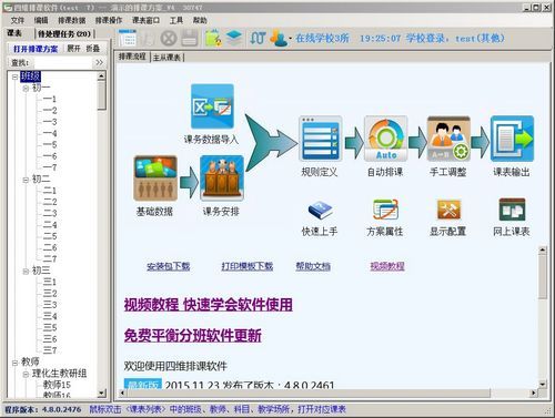 终极排课软件4功能特点:企业级排课软件 安全、可靠,安装方便,硬件损坏、病毒木马都不会破坏数据。专业的排课软件 先进的平台、专业的操作界面、可靠的软件质量。强大的排课软件,多个排课方案、多个课表操作、可视化规则、拖放式调课;集成网上课表;集成Excel数据导入导出、Word自定义的课表打印;支持单双周、支持早晚自习辅导、支持合班、连堂、多教师、多场地;支持教案对齐(教师小循环、教师授课同步)、支持教师连续授课超时检测;多维度智能排课 同时关注班级、教师、课程和场地,多个班级综合排课。以人为本的软件 优雅的无干扰提醒模式,创新的无流程排课软件,保证操作的流畅自然;允许冲突、允许违反规则,相信使用排课软件的老师是具智慧的。