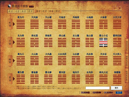 本软件详细介绍了易经六十四卦象,并可通过阴阳来快速的查找出所需卦,还可分析卜卦,对易经初学者有很大的帮助。