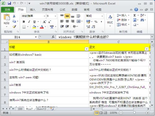 Windows 7使用问题答疑汇总的Excel文档。该文档中共有约3000个提问和回答,应广大网友需求整合而成。它可帮助用户更好地使用Windows7系统,以充分发挥出Windows7的强大优势。