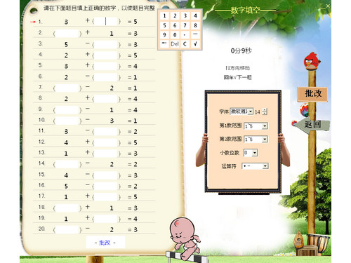 本软件是为小学低年级学生量身定制的小学生口算/心算训练软件。特点:1、随机生成各种类型的四则运算题目。2、直接输出到Word并打印。3、在线训练,电脑直接批改。4、6大主模块:数值运算、比较大小、数字拆分、数字填空和运算符和课堂实战。5、4大常识性模块:认识时间、认识人民币、人民币应用、算24点。6、每个模块分成多个等级,从大班到小学4年级的同学可各取所需。