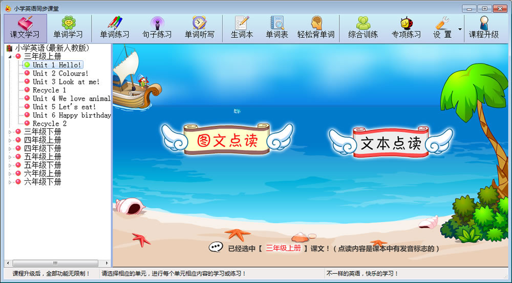 软件与最新版小学英语教材同步(包括十余个教材版本,覆盖现在全国大部分英语教材内容),英语课文、单词全部为原声真人发音,课文有图文点读,点读时可以复读,变速等。单词的中文为真人标准普通话发音,不是机器发音可以比的,听着亲切,学得舒适。课文学习时,可以点读相应的句子发音和翻译,单词学习时,有多个例句辅助,有很多形象图片记忆理解,例句都有真人发音。内容按单元分类,可以同步进行单词、课文、句子等的学习和测试等。界面采取简洁漂亮的flash界面,互动性及可操作性强!软件内容有“课文学习”、“单词学习”、“单词练习”、“句子练习”、“连词成句”、“单词听写”、“轻松背单词”(对复习各册内容很有帮助)、“生词本”、“生词练习”与“专项练习”等,每项内容都是我们精心制作,为的是给孩子真正学好英语的舞台和环境!