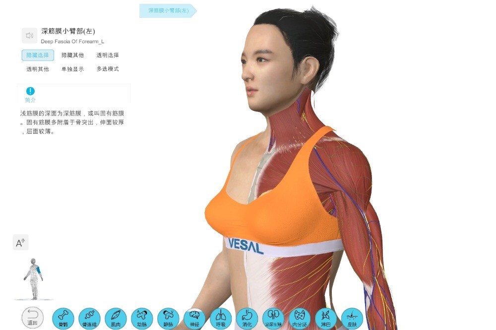 ● 全人体解剖资源:覆盖宏观(骨骼/肌肉)到微观(细胞/纤维)的人体结构,含15000+解剖结构及微观模型。