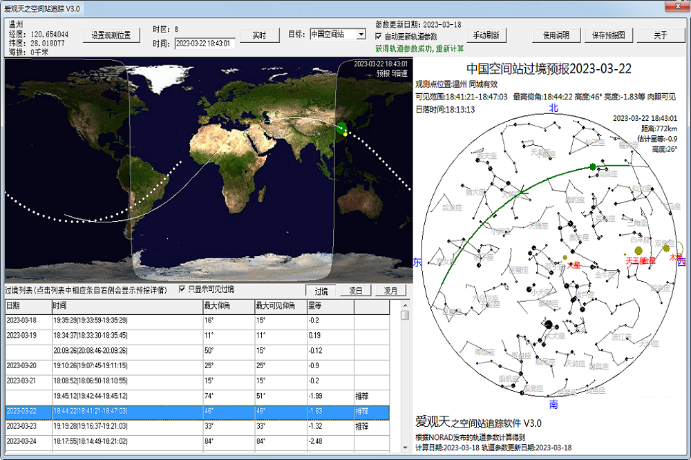 《爱观天之空间站追踪》是一款免费软件,使用它可以查询中国空间站和国际空间站的实时位置,可以获得适合进行目视观测的过境预报和适合用专门设备进行拍摄的凌日和凌月预报,让你无需专门设备亲眼看到中国空间站和国际空间站从天上飞过。另外本软件也支持哈勃太空望远镜和我国第一颗人造卫星东方红1号的过境预报。