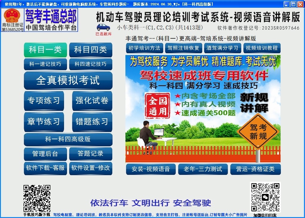 驾考丰通视频版理论驾培系统,包含科目一、科目四、驾照注销恢复、酒驾满分学习、学法减分、三力测试,丰通驾考宝典软件,开发电脑手机屏幕文字、语音朗读,真人视频讲解,替代老师讲课,适合驾校培训班理论一点通教学使用,对于文化基础差,阅读能力低的学员培训、讲解交规技巧,速记考题方法,让您轻松通过车管所理论考试。