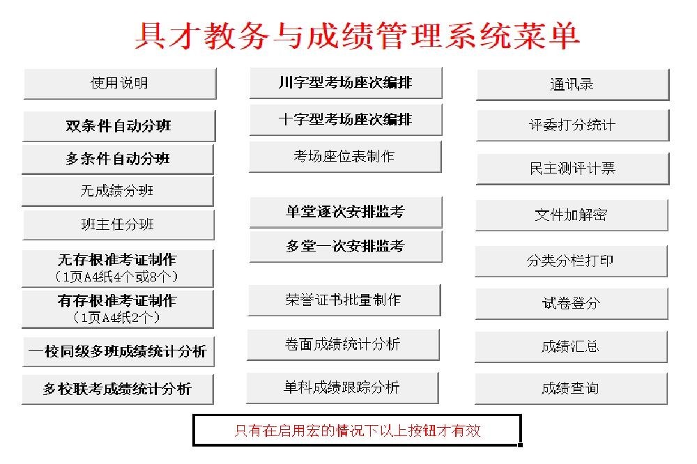 软件特点:①在Microsoft Excel平台上运行;②系统含有二十多个子软件;③根据学校的实际需要设置有关功能,是教育管理部门、学校领导、教务人员、班主任、教师的得力助手;④只要导入原始数据,施以无需记忆的按钮操作,依托贴心的人机对话功能,就可自动得到各种结果,无须专门培训;⑤与同类软件相比,优势在于项目的齐全性、操作的方便性、功能的实用性。
