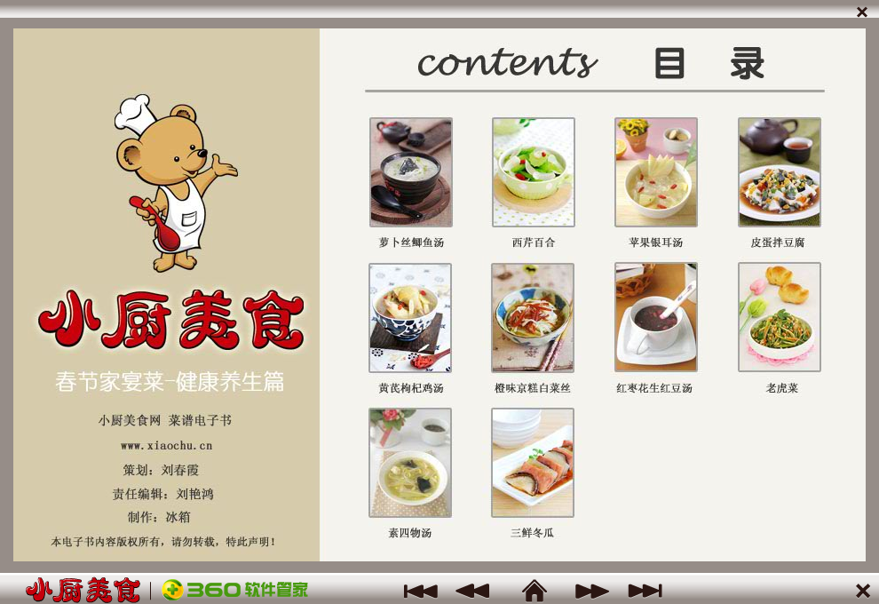 小厨美食网2011新春年夜饭主题菜谱电子书。它精选收录了30道适合新年享用的精美菜肴,有桂花红油鸡、孔雀开屏鱼、芝麻豆皮卷,还有美味又滋补的鲫鱼汤……从原料选取、烹饪步骤、制作贴士到作者介绍等都一应俱全。所选菜肴色香俱佳,荤素搭配,让一家人吃得健康全面。还在为年夜饭做准备?那就翻翻这套菜谱,在家人和亲友面前露一手。