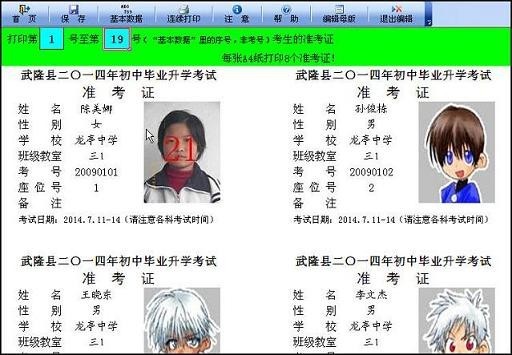本软件适用于准考证的批量打印制作。能快速制作并生成准考证,一键连续批量打印。有存根的每张A4纸打印2个准考证,无存根的每张A4纸打印8个或4个准考证。支持照片打印。 还配赠有考场座位表制作、通讯录管理、教师登分、民主测评计票、标准分转换、文件加解密、分类分栏打印、成绩分段统计、评委打分统计、成绩查询、成绩汇总等软件。