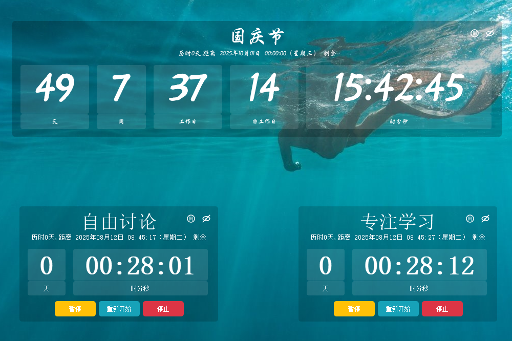 3. 多任务支持:支持同时设置多个倒计时,能够高效管理多项任务或事件。针对春节、国庆等常见节假日,还提供快速创建功能,无需手动输入大量信息,一键即可完成节假日倒计时设置,节省操作时间。