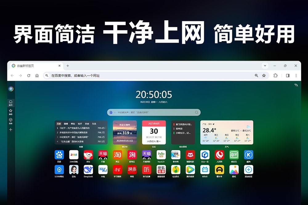 白鲨浏览器个性化新标签页提供实时天气、日历、高清壁纸、待办提醒、在线翻译、在线工具、纪念日、倒计时、网址管理、记事本……等功能;