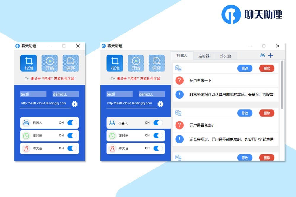 聊天助理启动后,就像人坐在电脑前盯着屏幕一样,不管对象聊天工具是QQ、钉钉、微信还是微博等等,都可以用机器人智能的收发和回答消息;也可以同一时间在多个聊天工具软件之间联动操作,定时发送像生日祝福之类的通知信息等等;在这些日常领域都可以模仿和代替人工,减少人员相当的重复劳动工作量,极大地增强了办公效率。使用中,所见即所得、即插即用,可以个性化定制、跨多平台,和二次开发。