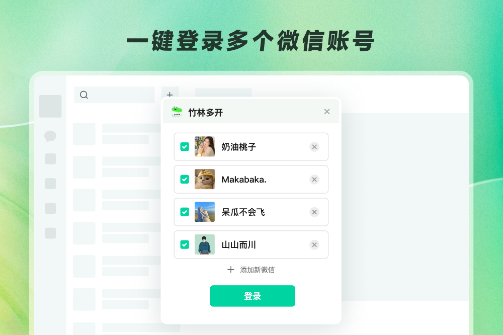 竹林多开是一款简单易用的微信双开、微信多开软件,是用于电脑PC版的微信多开工具,可以同时登录多个微信号,统一窗口管理。微信消息提醒让管理更加便捷,有效提升办公及沟通效率。