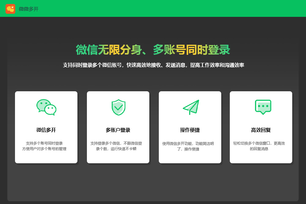 微微多开是一款专为同时管理多个工作号和个人号,需要处理多个业务账户的用户群里提供便捷高效的解决方案,可以让您在同一台设备上同时使用和管理多个微信账号,提升工作效率,减少重复打字,帮助您用最少的精力和资源,管理更多的用户,让您的整体效率达到最大化。 产品的功能 1:支持同时登陆多个微信 2:多个微信任意切换 3:轻松管理多个账户,快速回复消息 4:一键自动登录所有微信 5:自定义话术管理 6:安全稳定,无风险,无广告 7:对微信没有任何影响