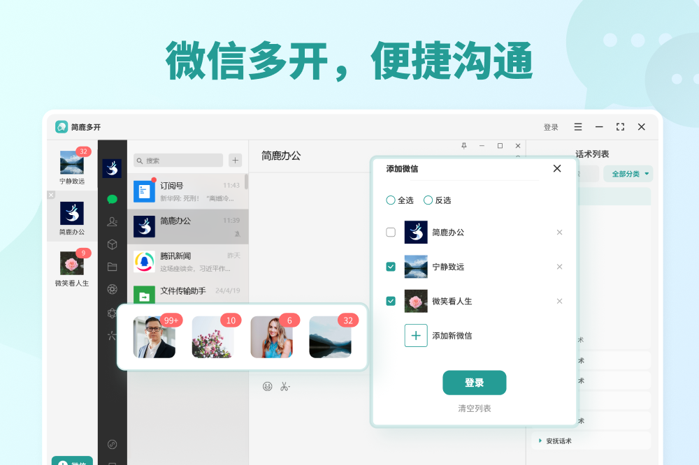 微信多开/微信分身/微信双开。 支持同时登录多个微信账号,快速高效地接收、发送消息,提高工作效率和沟通效率。 微信多开软件,不限微信登录数量,一台电脑同时登录多个微信。 电脑微信双开,轻松切换聊天窗口管理微信,告别杂乱桌面。 电脑微信多开,提供消息提醒和话术管理,支持添加话术图片、表情,一键回复,提高沟通效率。 电脑双开微信,话术导入和导出,通过共享同一套话术, 提高沟通技巧。 多开锁定保护隐私,再不必担心信息泄露,多开锁采用专业的加密技术,安全性高、资源消耗低。