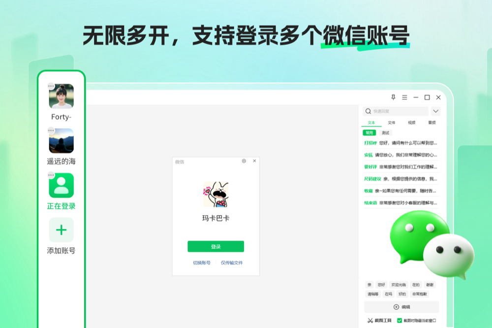 电脑同时登录多个微信+常用回复秒发送,支持最新版微信! 为什么选它? ✅ 电脑同时开10+微信(支持最新版微信) ✅ 高频回复话术/图片/文件秒发(双击直接发送) ✅ 所有微信同屏操作,消息不漏看 ✅ 账号免扫码自动登录(即将支持!)
