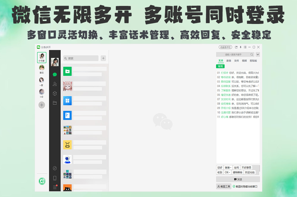 分身多开提供让用户在同一台设备上,同时登录、使用、管理多个微信账号的功能,提升聊天沟通效率;同时,还提供微信垃圾清理、聊天记录备份、图片压缩、隐私清理等AI百宝箱功能。 功能特性: 1、支持同时登录使用多个微信账号,安全、稳定、高效; 2、可灵活管理定位各个微信窗口,快速切换账号,高效沟通回复,提升办公效率; 3、内置丰富话术库,可自定义编辑,减少重复打字,支持文本、表情包、视频、剪贴板历史记录等; 4、兼容并支持微信4.0新版; 5、安全稳定高效,防病毒安全厂商鉴定,纯净无广告;不改变微信数据,运行稳定无封号风险; 6、微信垃圾清理、大图片智能压缩发送、成人隐私检测等AI百宝箱功能。