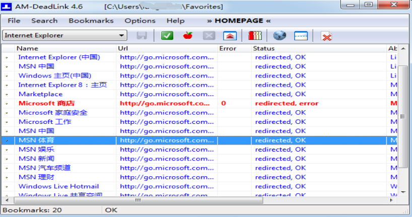 AM-DeadLink是一个简单易用的探测超链接的免费工具.它可以帮助您检测出您的收藏夹中的无效链接和重复链接.它支持包括Internet Explorer,Firefox,Mozilla,Opera,Netscape等所有主流浏览器的书签以及逗号分隔文件和跳格定界文件.