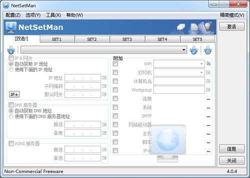 一个小巧好用的网络设置工具。可以针对不同的网络环境,用快速的方法帮指引您更改所需的网络设置值。您可以设置五组不同的网络设置值,让使用者根据不同的泡网环境,调用不同的设置值。使用NetSetMan,可以省去许多时间,处理各种繁杂的网络设置步骤。方便您设置计算机IP地址、子网络遮罩、默认信关、DNS、计算机名称、DNS Domain、工作组、WINS等。除此之外还可以运行Script(例如:*.bat文件)。