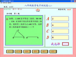 《八年级数学电子测试(上)》是“导航星工作室”制作的“电子测试”系列软件之一。该软件是一个测试系统。可用于学生进行单元自测或教师组织模拟考试。题库中所选试题以新课标为指导,与人教版新教材同步。试题都是极具代表性的典型试题,形式都为选择题。题量多、内容广,几乎涵盖了教材中所有的知识点。可自由选择测试内容,也可由电脑随机组卷,每套试卷有40个题,测试时间为1小时。1小时后自动交卷,交卷结束即可判出试卷,给出成绩,同时排出名次。此时可查看试卷中错误的试题。