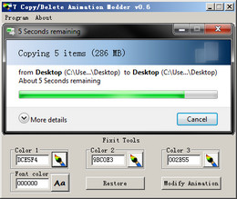 一直以来windows的复制粘贴删除功能的颜色都是灰色的,不可更改,如果您是位追求个性的网民,这个7 Copy Delete Animation Modder应该能够满足您对这方便的修改需要,它是一款Win7复制窗口颜色修改器,它可以帮您修改windows 7复制、删除动画提示窗口的色彩。
