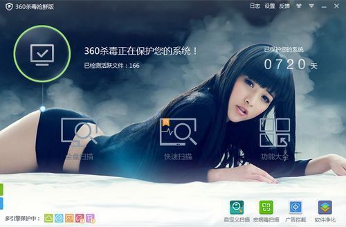 360杀毒5.0“云巅”通过重构的系统文件引擎,集大成的全能扫描功能及新增的专业级安全防护中心,为您带来更安全、更专业、更有效、更新颖的查杀防护体验,它不仅继承了4.0版的优良品质,更是带来了全新的监控引擎和防御架构,保证对各种恶意文件的监控更严密、发现更及时、定位更精确和处理更迅速。在快速扫描和全盘扫描中,集成了上网加速、磁盘空间不足、建议禁止启动项、黑DNS等扩展扫描功能;在新增的安全防护中心界面,所有防护组件状态一目了然,您可以实时查看防护数据;在全新改版的皮肤中心页面,新增了皮肤透明度调节和自定义换肤功能,您可以自主裁剪本地图片作为皮肤,任意收藏和分享,还可实现自动换肤功能,每天都有新面孔、新感觉,让您在尽享安全之余,更能有便捷、愉悦的使用体验。更多更新的功能尽在杀毒5.0抢鲜版,云峰之巅,期待您的探索和发现!