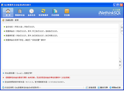 《SQL数据库备份恢复助手》(以下简称:iNethinkSQL)完全免费、纯“绿色化”、无需安装、操作便捷,支持本地/局域网(远程)数据库自动/手动备份。可自由组合的无限复合式备份任务,支持备份文件ZIP压缩后通过Lan/Ftp/云(金山快盘)/Email传输存储,Email日志信息发送,自由删除指定周期与存储位置的备份文件,还具有安全可靠的SQL数据库恢复功能。