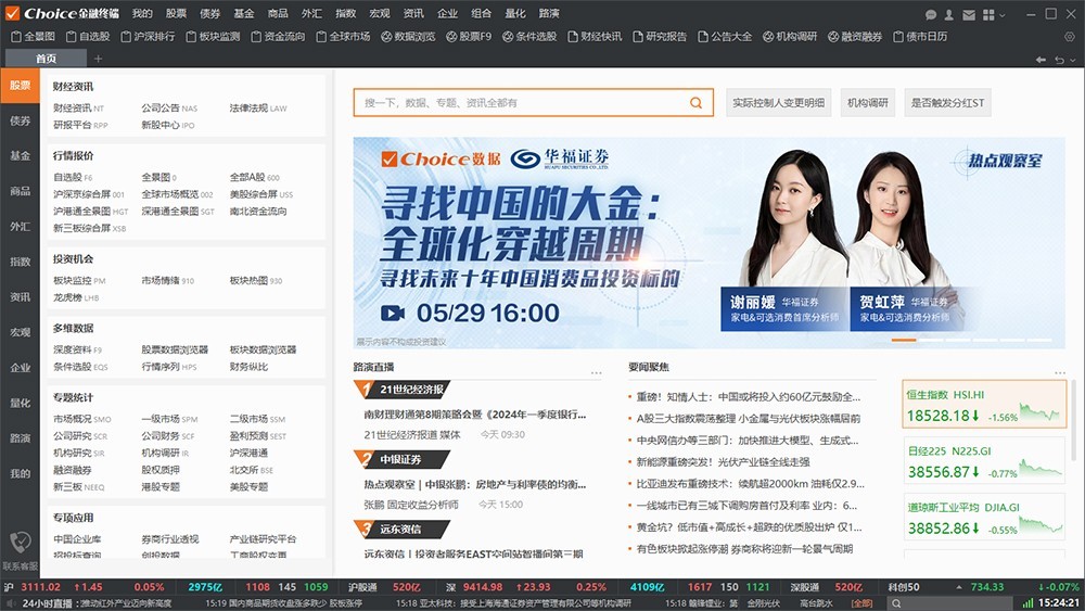 Choice金融终端是一款专业的金融数据分析与投资管理软件,致力于为金融机构、学术研究机构和专业投资者提供优质的金融数据资讯及相关服务。终端内容涵盖股票、固收、基金、商品、外汇、宏观行业等领域,提供Excel插件、量化接口、组合管理等应用工具,集信息查询、统计分析、应用于一体,是金融市场参与者的专业工具。