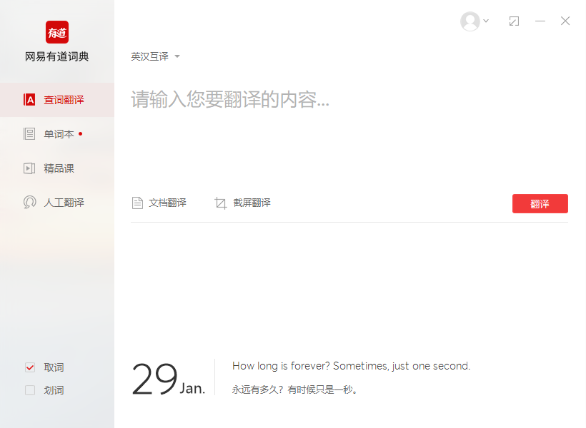 有道词典支持中、英、日、韩、法、德、俄、西班牙、葡萄牙等41种语种翻译;内置超过65万条英汉词汇,超过59万条汉英词汇,2300万海量例句;屏幕取词更快更准,鼠标轻放,帮助你轻松查阅;划词翻译轻轻一划,翻译全知道;完整收录《朗文当代高级英语辞典》、《柯林斯COBUILD高级英汉双解词典》以及《21世纪大英汉词典》;“网络释义”功能,轻松囊括互联网上的时尚流行热词,聚合维基百科、百度百科内容,囊括2000W百科词条。