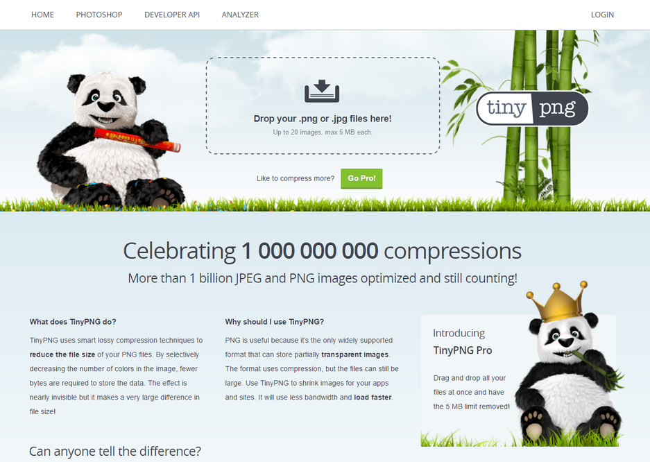 TinyPNG 是一款在线图片压缩工具,采用智能化有损压缩技术来降低 PNG 图片大小,而这个方法可以透过降低图片中的颜色数量,来减少储存图片所需的空间,这个作法能够大幅降低图片的大小,但又不会造成图片过度损坏、像素降低等等,至少从肉眼上看不太出来差异,且能够保存 PNG 的 alpha 透明度特性。
